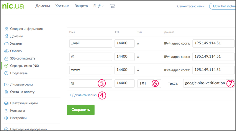 - Нажмите кнопку «Сохранить». Через некоторое время вы сможете подтвердить владение доменом.