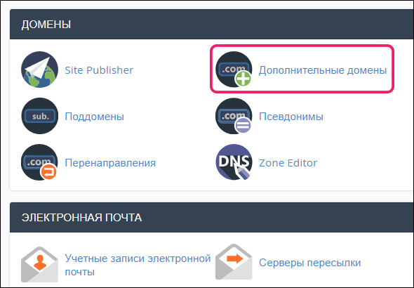 Чтобы хостинг начал работать с вашим новеньким доменом, вам потребуется раздел «Домены», пункт «Дополнительные домены»: