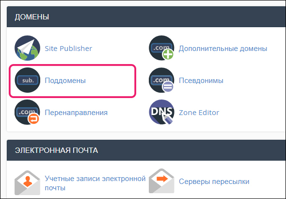 Чтобы хостинг открывал поддомен, вам потребуется тот же раздел «Домены», но вот пункт — «Поддомены»:
