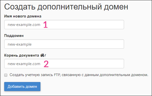 Что от вас потребуется, так это лишь ввести название вашего домена (1) и нажать на кнопку «Добавить домен». По-умолчанию, папка для нового домена будет создана в корне хостинга и будет иметь такое же название, как и сам домен. Вы можете прописать любой другой путь к папке нового домена или переименовать её (2):