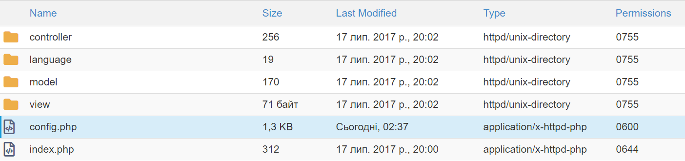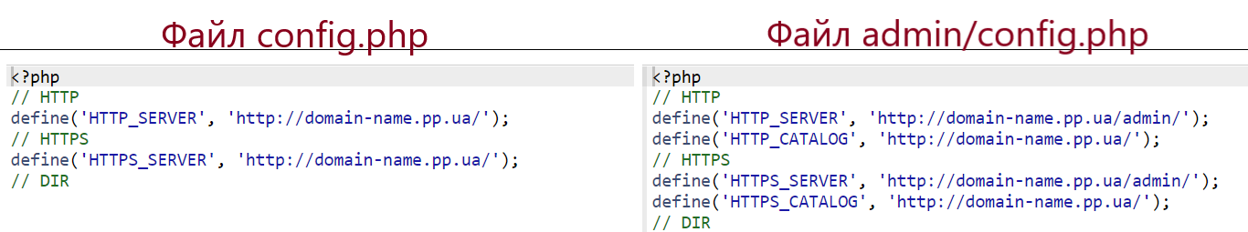 Сначала необходимо будет внести правки в файле config.php, который выделен на изображении синим цветом. Затем перейдите папку с названием 'admin', в которой также необходимо найти файл config.php.