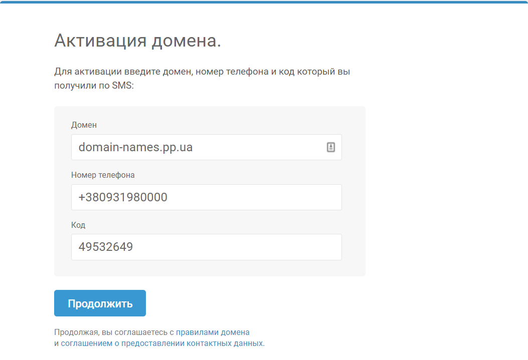 Для активации домена используйте форму по ссылке — https://apu.drs.ua/ru. В форме введите имя домена, контактный номер телефона и код, который был получен.
