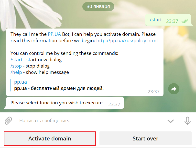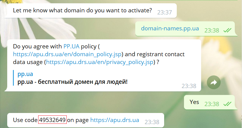 Следом получите от бота код и ссылку на форму для активации доменного имени.
