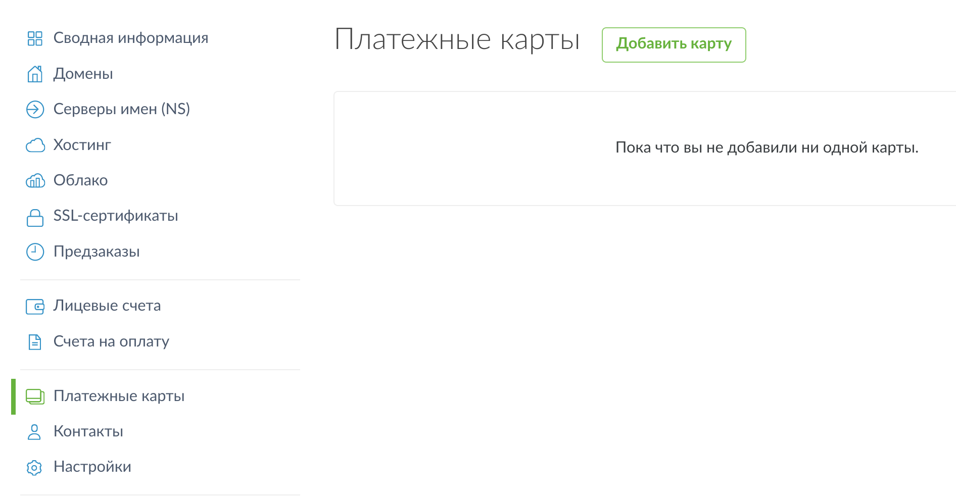 Чтобы добавить карту войдите в ваш аккаунт NIC.UA и слева в столбце выберите пункт "Платежные карты". Нажмите на кнопку "Добавить карту":