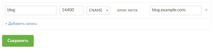 - Имя: из-за особеностей работы записи CNAME, она используется только для поддомена. Например, для «blog.domain.com» будет достаточно внести имя «blog»;