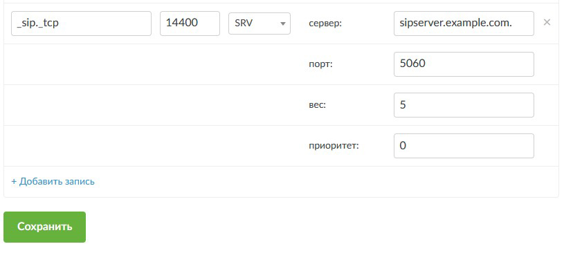- Имя: должно содержать тип сервиса и протокол передачи. Для SIP, который работает по TCP, это имя будет "_sip._tcp". Оба значения всегда начинаются с нижнего подчеркивания;