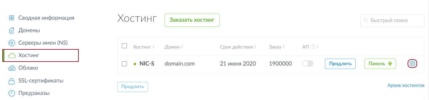 Для этого перейдите в раздел «Хостинг» и нажмите на шестерёнку возле заказа.