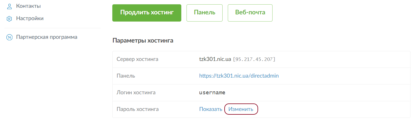 Нередко возникает необходимость изменить пароль пользователя для входа в панель хостинга. Это можно сделать в личном кабинете на сайте NIC.UA.