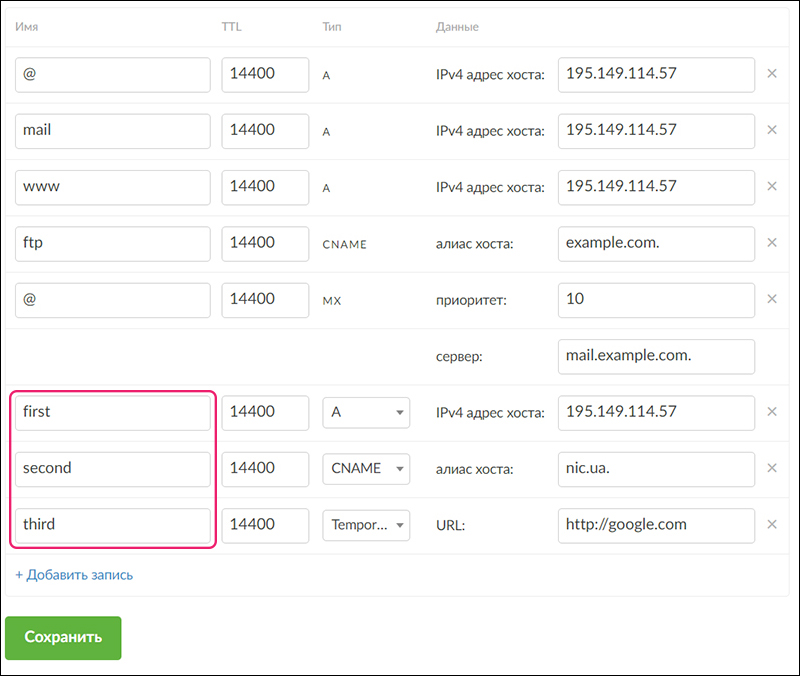 Название поддомена можно указывать любое, а их количество ограничено лишь вашей фантазией. Также поддомен может быть записью любого типа: CNAME / TXT / и так далее. На скриншоте ниже создано три поддомена: