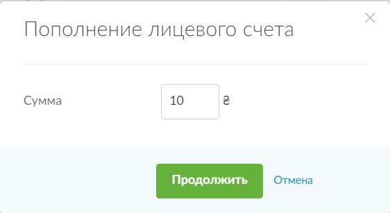 Затем введите сумму для пополнения и нажмите кнопку "Продолжить".