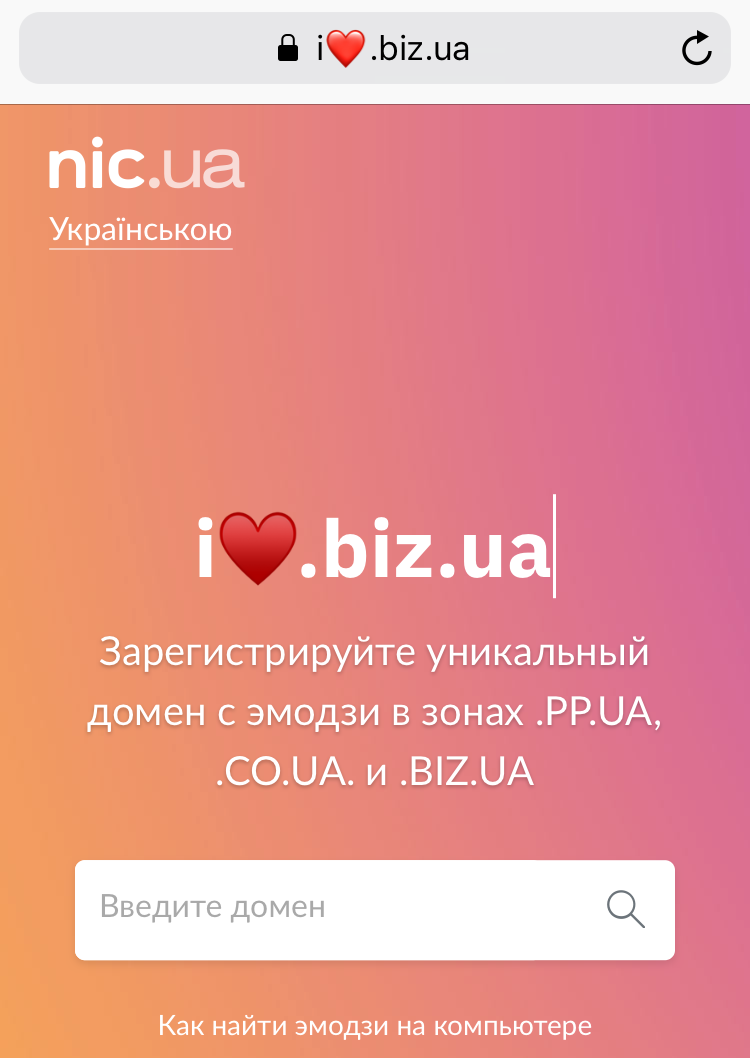 В 2018-м году в трёх украинских доменных зонах появилась возможность регистровать домены, которые содержат в названии эмодзи. В доменных зонах .BIZ.UA, .CO.UA и даже в бесплатном .PP.UA стало возможно использовать не только буквы и цифры, а еще и картинки. Как пример — i❤.biz.ua