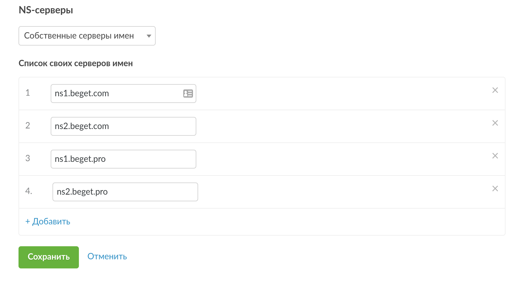 В свойствах заказа на домен в разделе "NS-серверы" выберите "Собственные серверы имен".