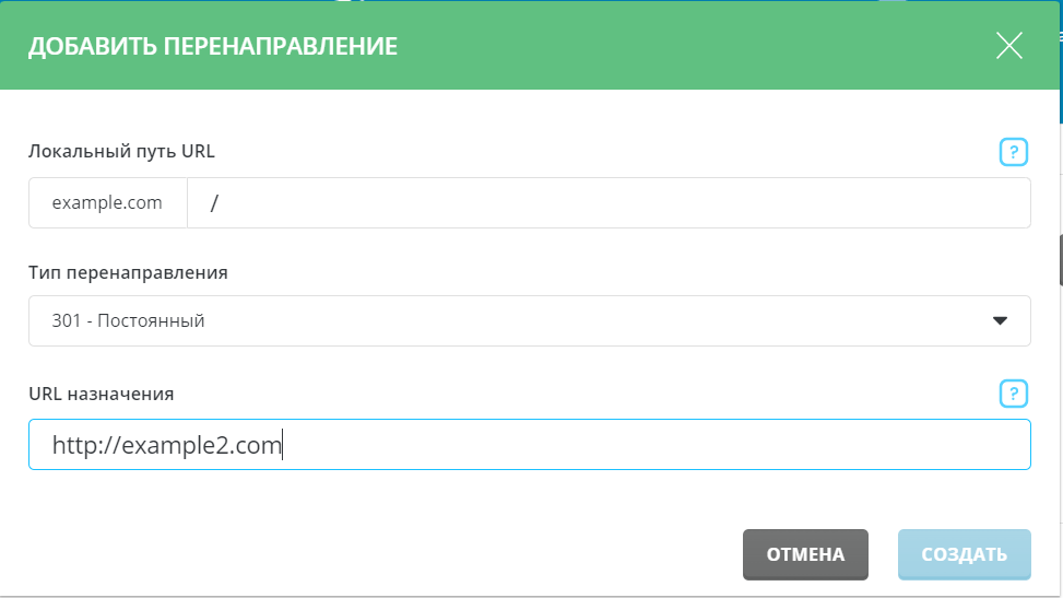 Поле открытия нового окна в первом поле выберите для какого URL-адреса нужно создать правило перенаправления. В следующем поле выберите тип перенаправления и укажите на какой URL-адрес нужно перенаправлять.