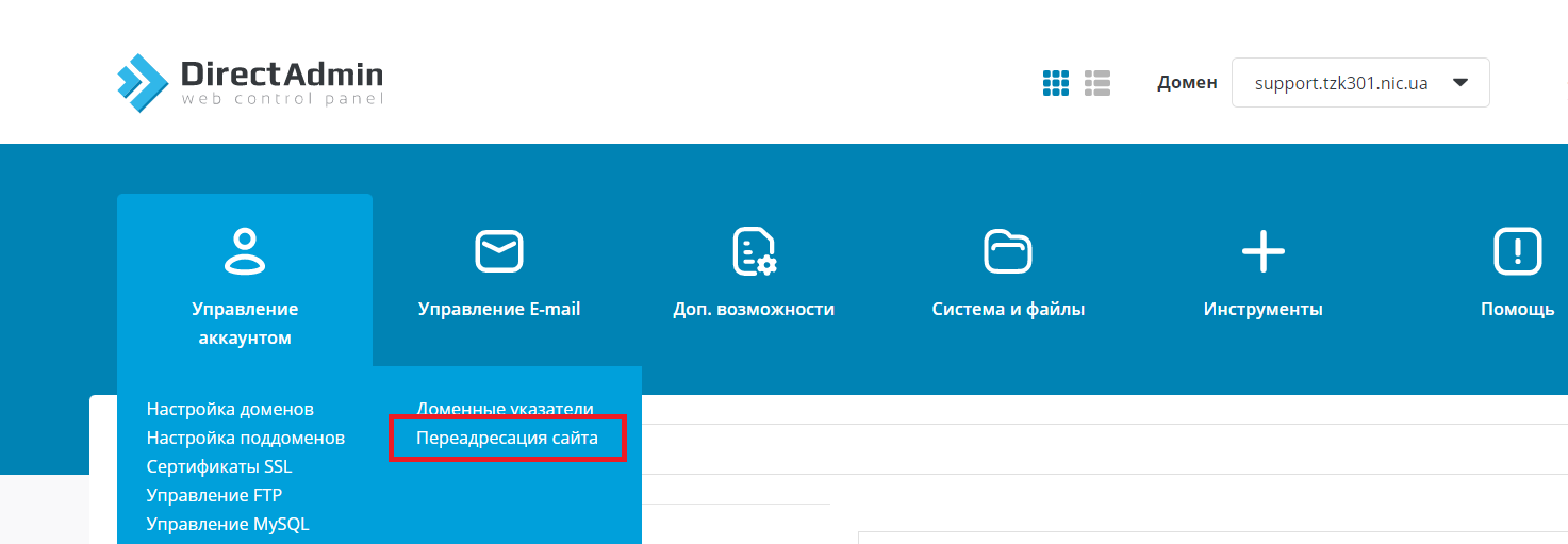 Для этого в панели выберите раздел "Управление аккаунтом", внутри которого выберите "Переадресация сайта".