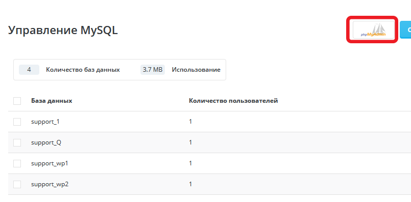 - И тут нажмите на иконку phpMyAdmin справа, над таблицей