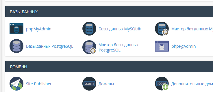 - В самой панели найдите раздел "Базы данных", и нажмите на "phpMyAdmin"