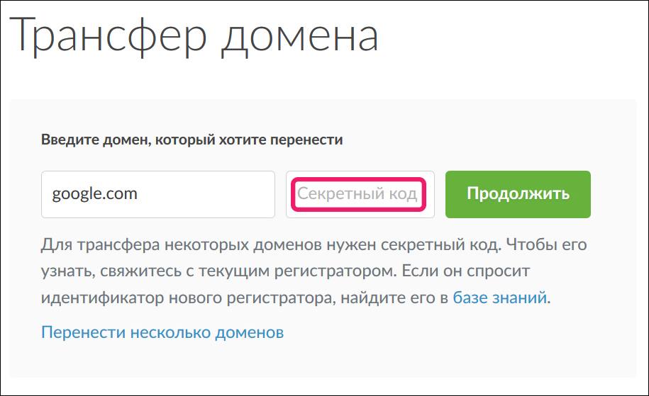 Когда коды уже у вас на руках, остается запустить трансфер домен. Открывайте раздел «Перенос домена», вводите имя домена и нажимайте «Продолжить»: