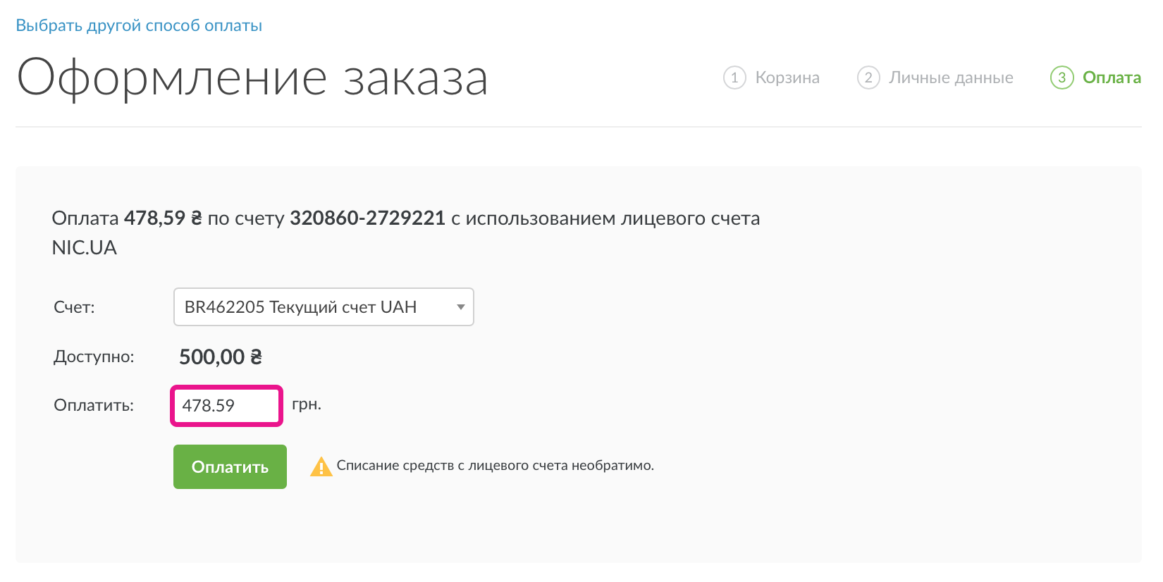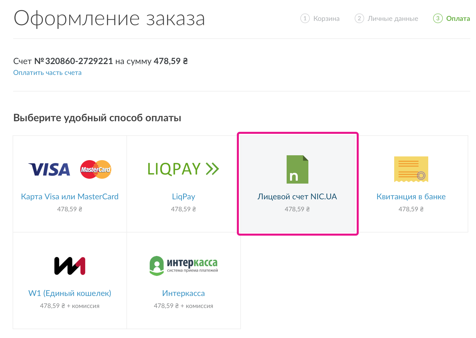 Удобство этого способа оплаты в том, что средства уже находятся в NIC.UA в вашем аккаунте, вам не нужно ждать пока банк переведет эти средства. Соответственно, все оплаты заказов с лицевого счета проходят практически моментально.