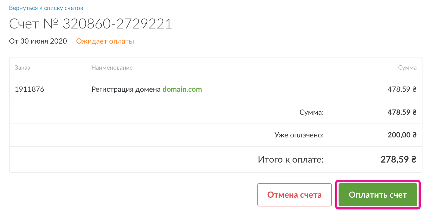 Либо же вы можете проверить детали этого счета (например, какой заказ оплачивается), нажав на номер этого счета и уже проверив все данные, переходить к оплате.