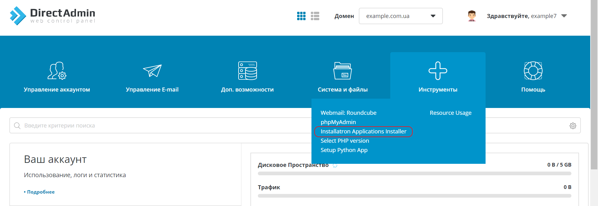Для установки CMS с помощью Installatron сначала перейдите в панель хостинга (следует использовать второй способ входа - с помощью формы авторизации). Затем выберите в разделе "Инструменты" пункт "Installatron Applications Installer".