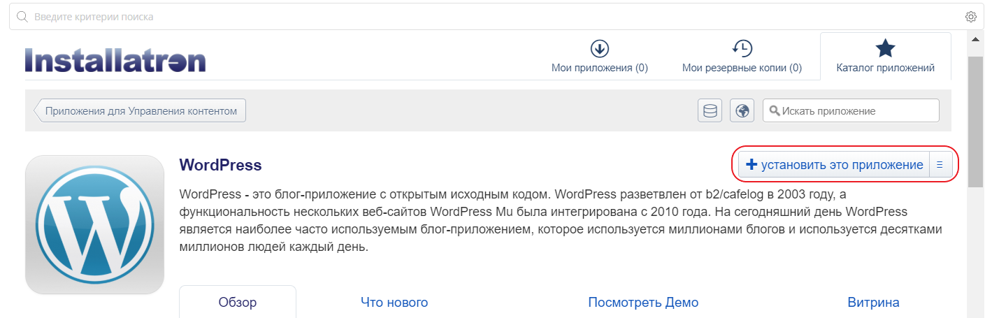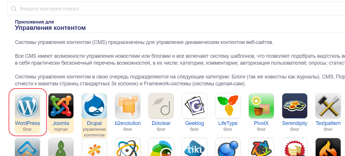 Затем, во вкладке "Каталог приложений", перейдите к разделу "Приложения для управления контентом" и выберите нужную CMS. В этой статье описывается процесс установки CMS WordPress. Установка других приложений выполняется таким же способом.