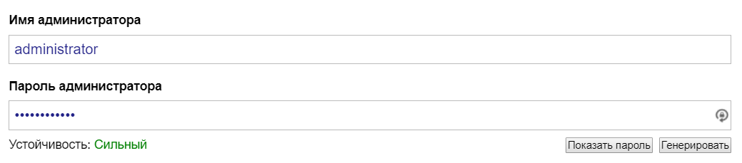 Также укажите имя и пароль администратора, которые будете использовать для входа в панель администратора сайта.