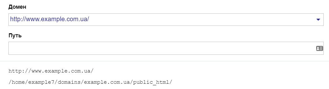 В открывшейся форме выберите домен, для которого будет устанавливаться CMS, и проверьте корректность пути корневого каталога (рекомендуем оставлять поле "Путь" незаполненным).