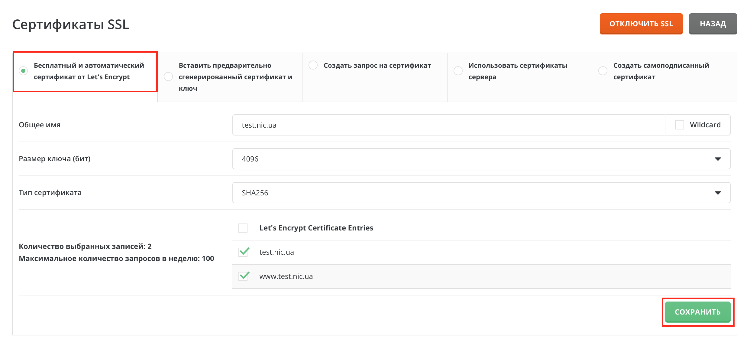 Выберите раздел "Бесплатный и автоматический сертификат от Let's Encrypt"
