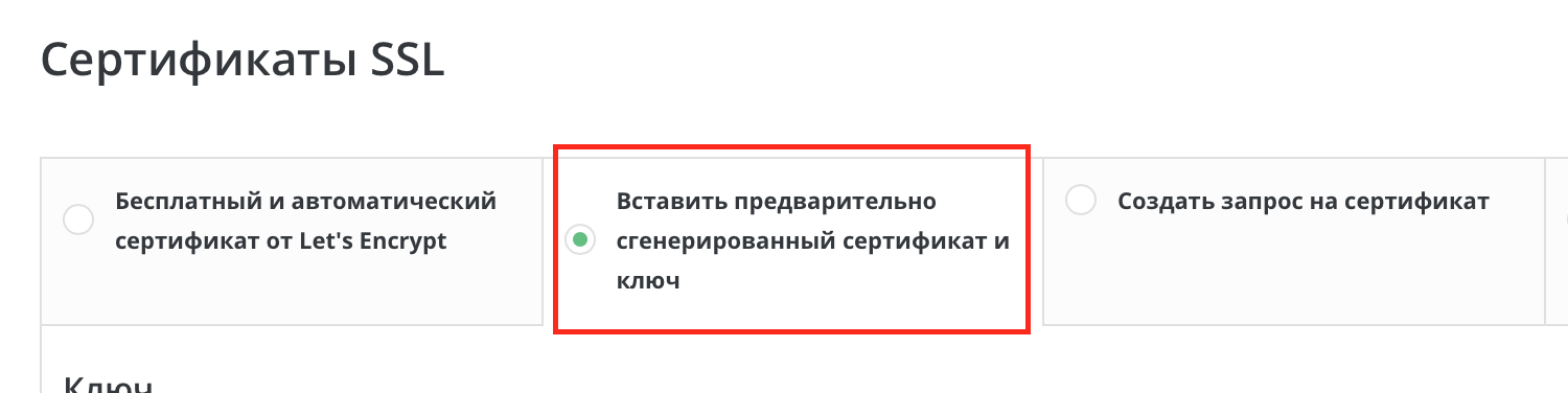 Вам нужен раздел "Вставить предварительно сгенерированный сертификат и ключ". Выберите его в списке вкладок: