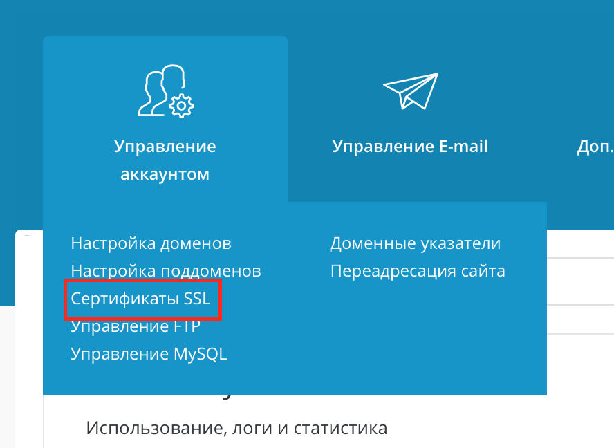 Чтобы установить собственный SSL-сертификат в панели DirectAdmin, откройте раздел "Управление аккаунтом" -> "Сертификаты SSL":