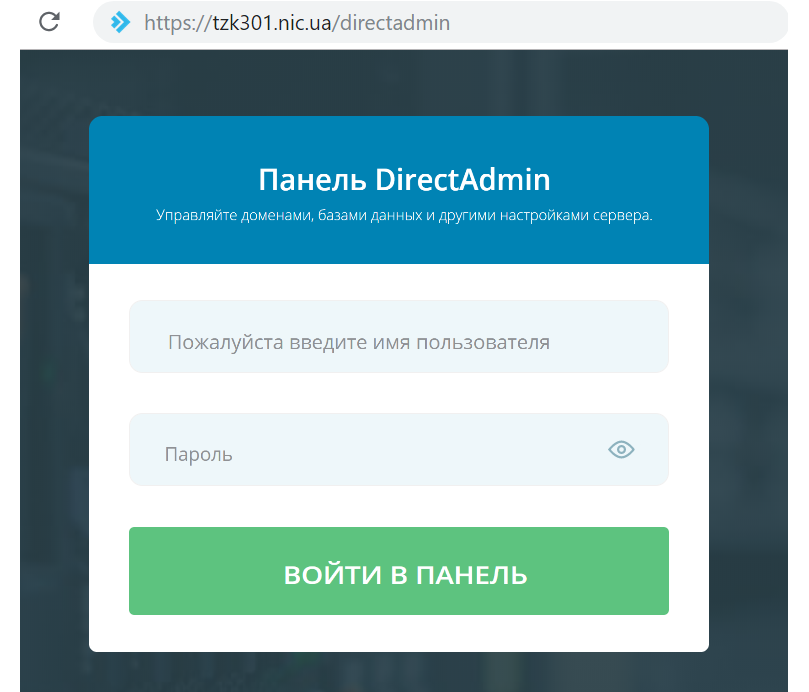 Введите в адресной строке браузера адрес панели (например, tzk302.nic.ua/directadmin). Затем укажите в форме логин и пароль хостинга.