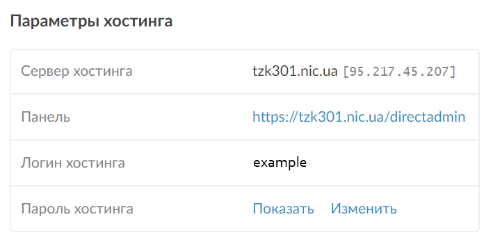 Для входа через форму авторизации, перейдите в личный кабинет и нажмите на шестеренку возле заказа на хостинг. Ниже на странице отобразится раздел “Параметры хостинга”. Из этого раздела вам понадобятся панель, логин и пароль хостинга.