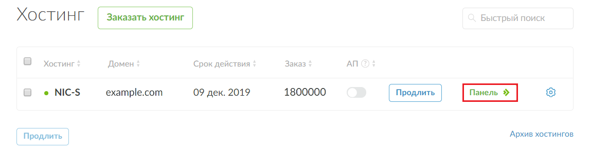 Для входа с помощью кнопки “Панель”, перейдите в раздел “Хостинг” личного кабинета и нажмите на кнопку, выделенную на изображении.