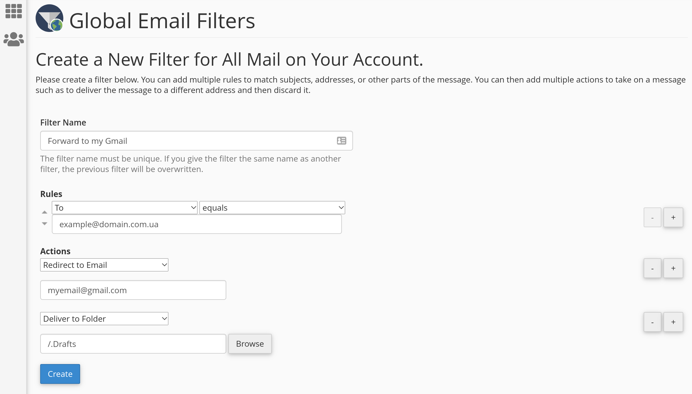 Настройка переадресации почты используя Global Email Filters в cPanel