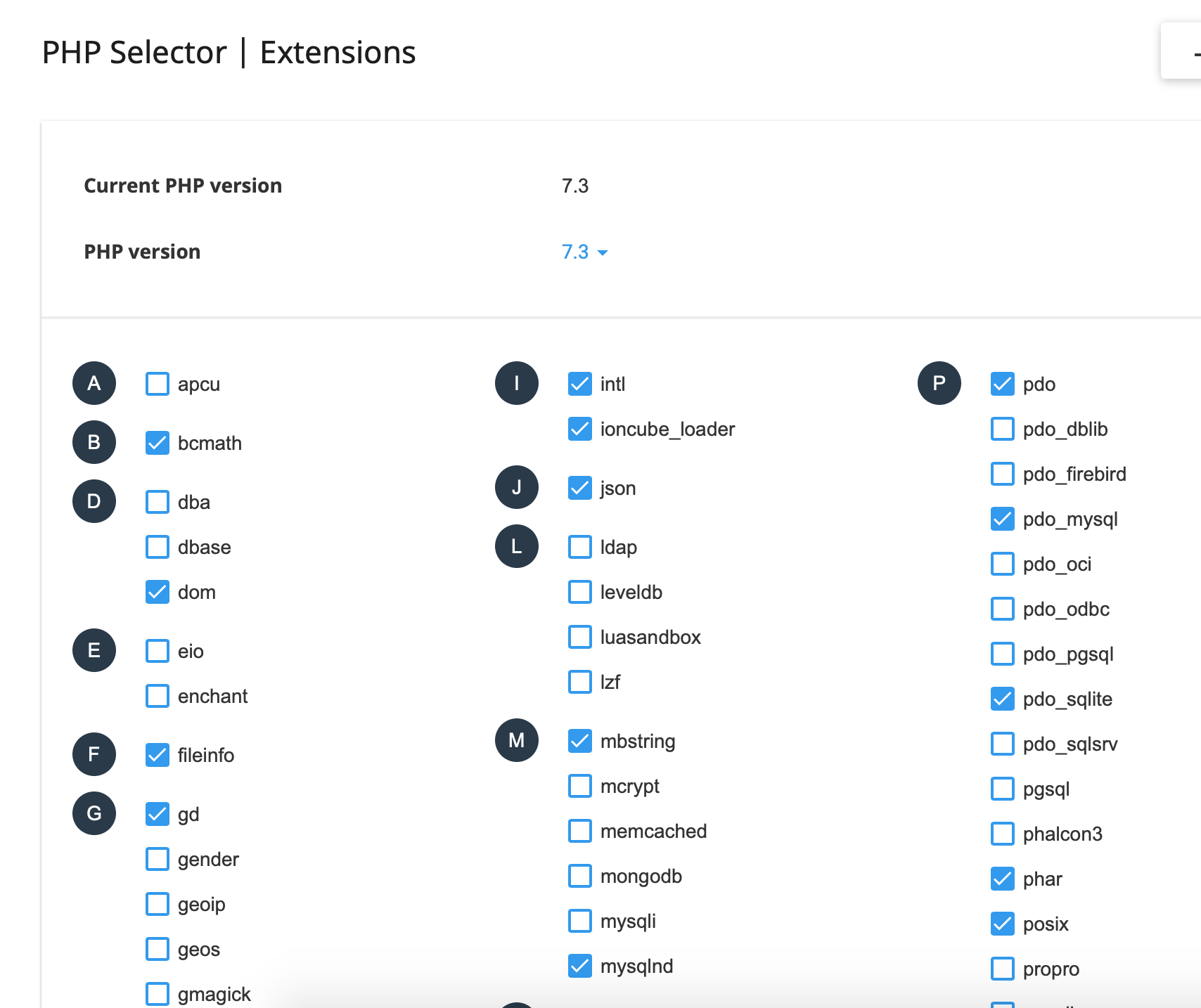 В этом разделе вы видите текущую версию PHP вашего хостинг аккаунта и можете изменить её. Ниже перечислены расширения PHP для этой версии. Включить и выключить их можно поставив и сняв галочку возле названия расширения.