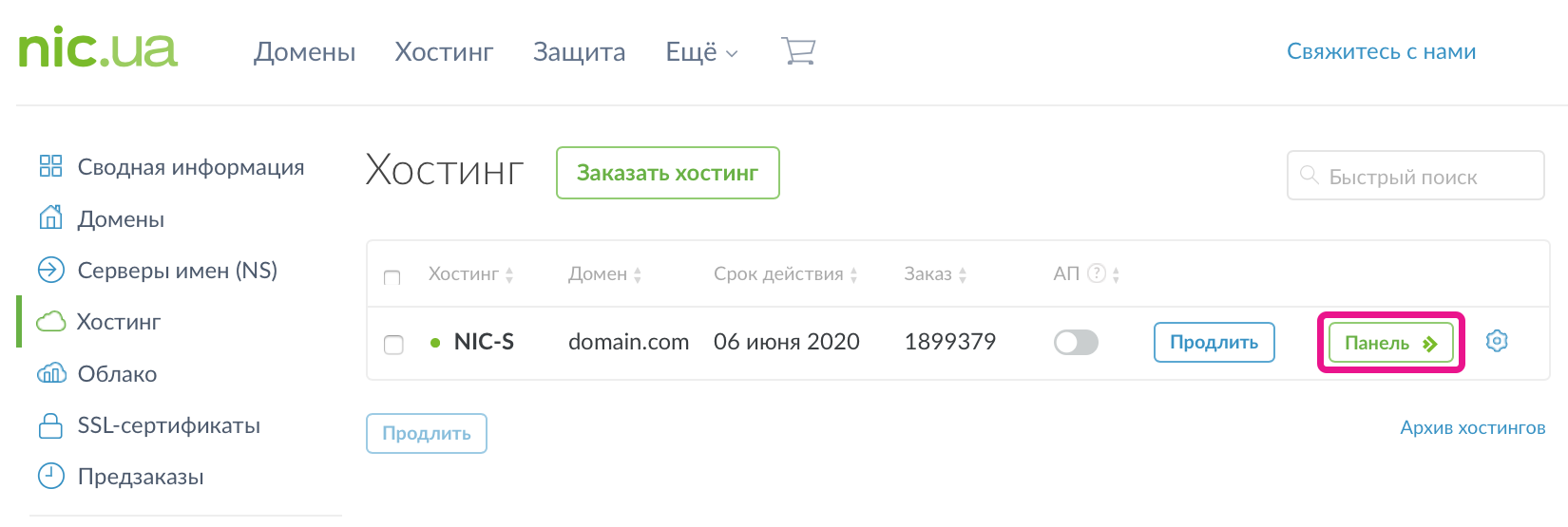 Для этого перейдите в раздел "Хостинг" в личном кабинете и нажмите на кнопку "Панель" возле вашего заказа.