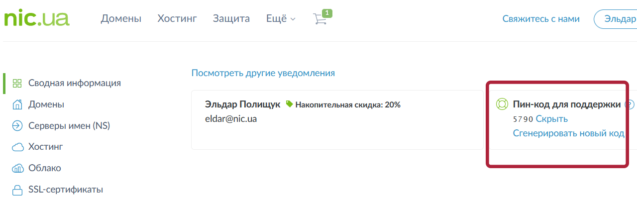 Для авторизации ваших запросов в поддержке иногда требуется предоставить пин-код: это 4 цифры, сгенерированные для вашего аккаунта. Поддержка NIC.UA может запросить его для подтверждения заказа услуги, переноса хостинга между аккаунтами и других операций.