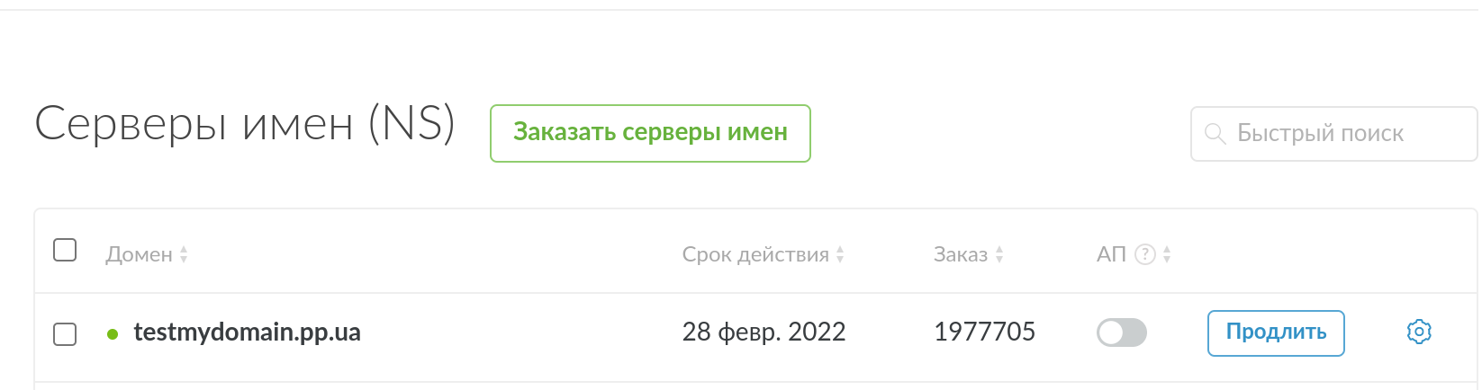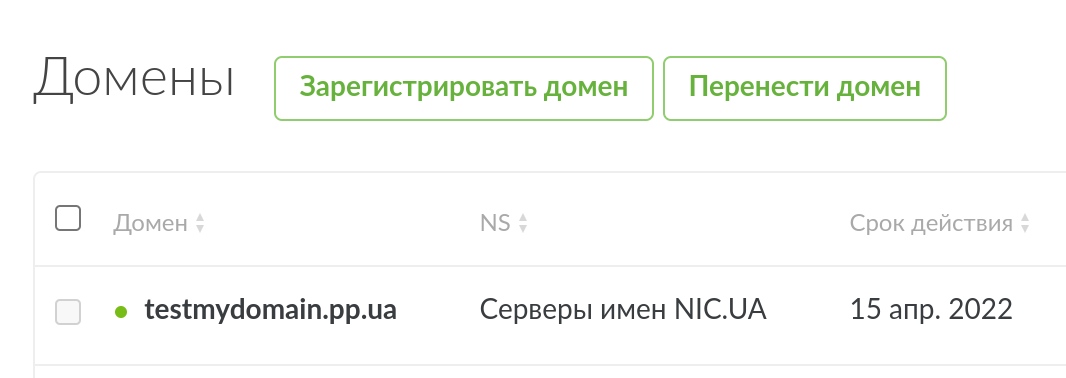 1. Перейдите в меню "Домены" личного кабинета NIC.UA, убедитесь, что ваш домен использует "Серверы имен NIC.UA".