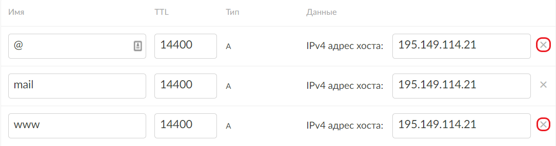 - Вместо 195.149.114.21для основного домена (имя '@') и поддомена www.example.com введите полученный IP-адрес