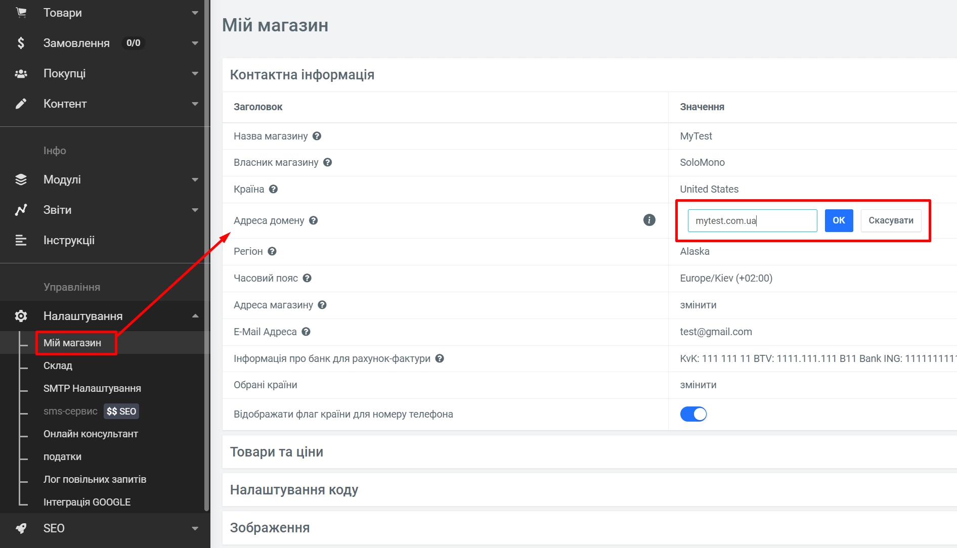 Далее нажмите на раздел "Настройки" => "Мой магазин" и укажите ваш домен в поле "Адрес домена", нажмите "ОК".