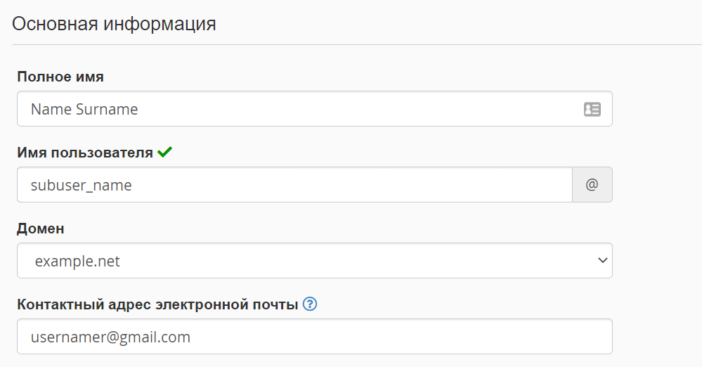 Сначала введите основную информацию о пользователе: полное имя, имя пользователя, домен и его контактный email.