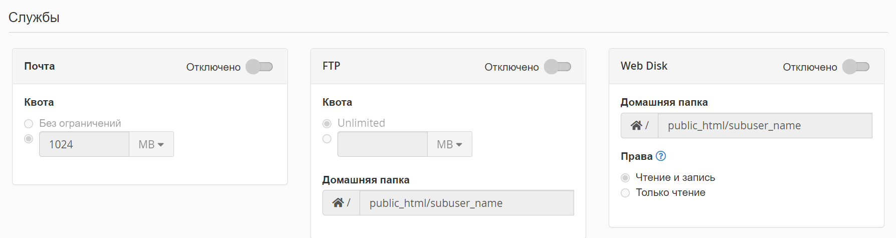 В конце выберите в каких службах будет создан такой пользователь. В случае со службами FTP или Web Disk проверьте к какому именно каталогу на хостинге пользователь должен иметь доступ.