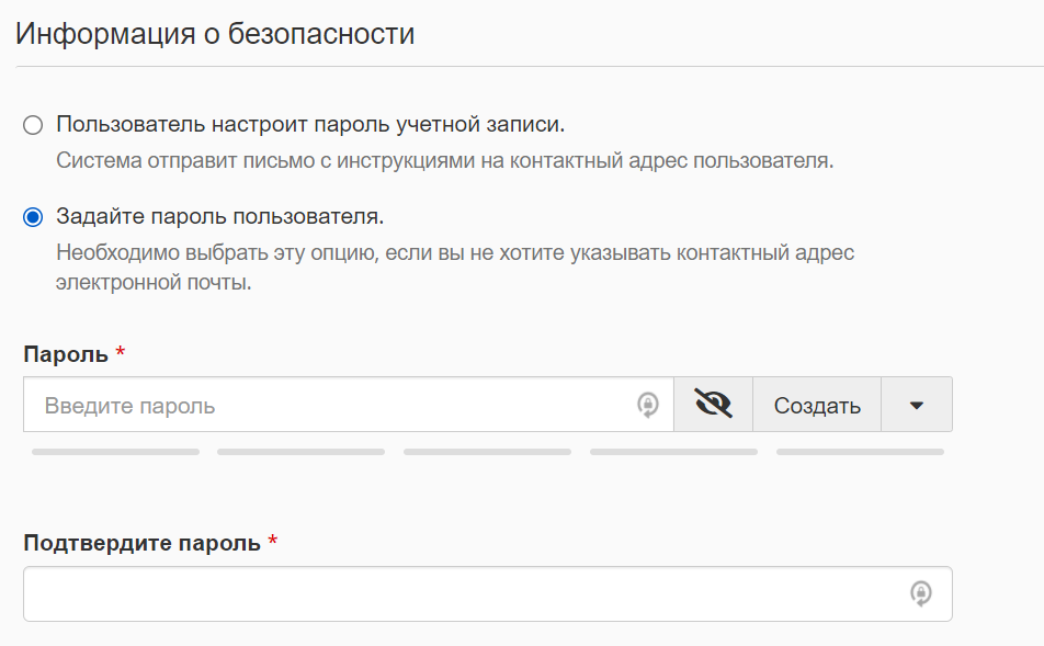 Затем выберите каким образом будет устанавливаться пароль пользователя. В первом случае пользователь получит на указанный email письмо, где будут предоставлены инструкции для активации учетной записи и ввода пароля.