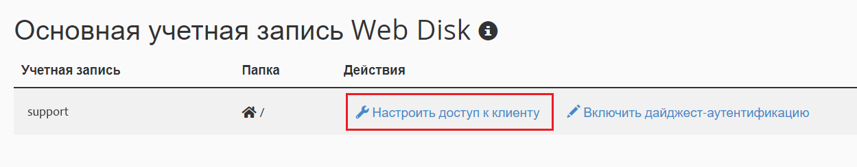 Чтобы получить данные для подключения к веб-диску, нажмите на кнопку "Настроить доступ к клиенту".