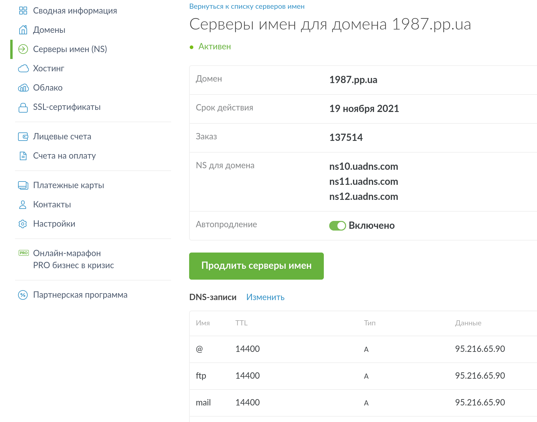 Управление находится в разделе «Серверы имен (NS)». Нажмите на шестеренку у нужных серверов имен и вы увидите таблицу со всеми записями. Для внесения изменений, нажмите «Изменить».