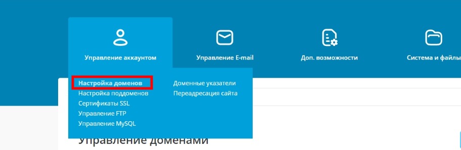 Эту проблему можно исправить самостоятельно в панели хостинга. В первую очередь следует перейти в раздел «Настройка доменов» в меню «Управление аккаунтом».