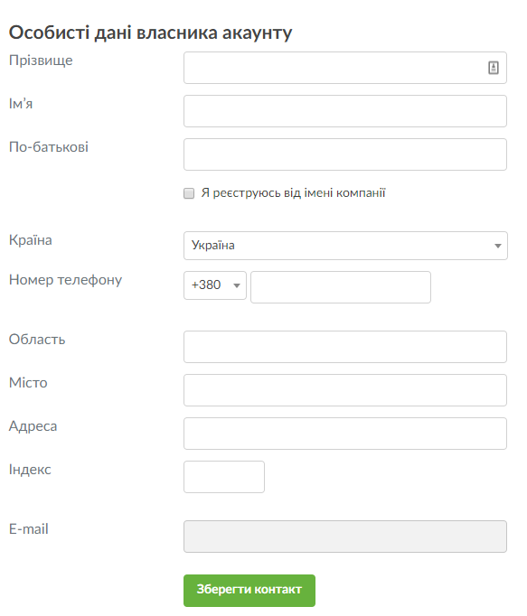 Зазначені в формі дані будуть встановлені як головний контакт для вашого облікового запису. Всі поля є обов'язковими для заповнення, крім «По-батькові» і «Область».