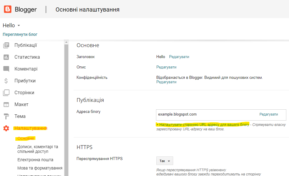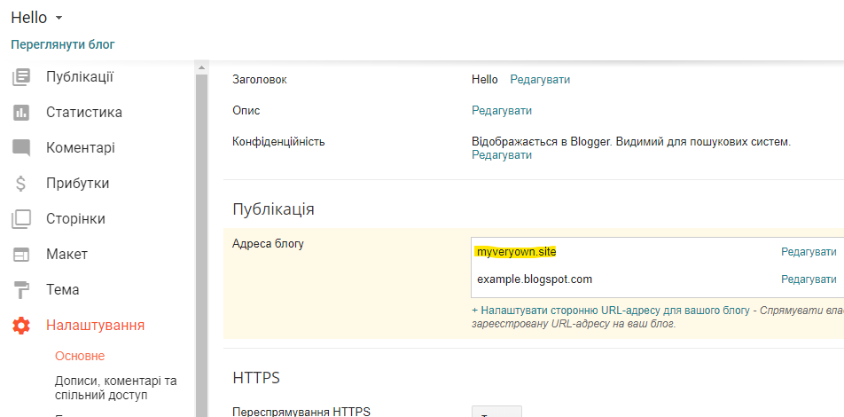 В першу чергу ви правда повинні ці записи отримати: увійдіть на blogger.com під своїм логіном, і відкрийте меню «Налаштування». Вам потрібен розділ «Адреса блогу»: