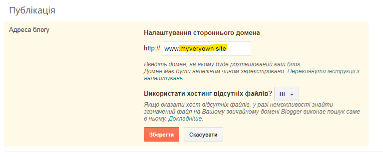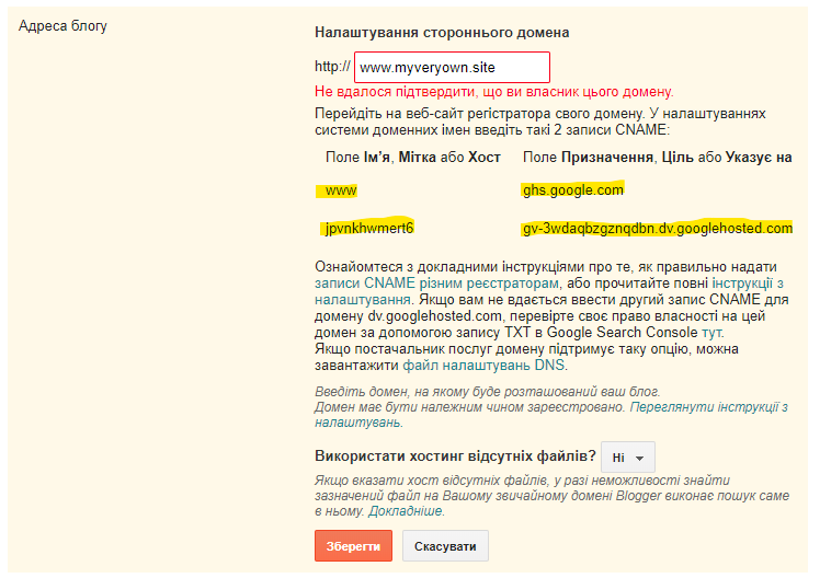 Збережіть створені записи і поверніться в інтерфейс Blogger. Вам потрібно в розділі «Адреса блогу» натиснути кнопку «Зберегти»: щоб сервіс перевірив правильність заповнення записів і зберіг ваш власний домен як адресу блогу:
