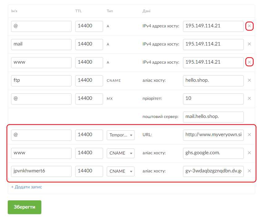 Відкриється меню для редагування і додавання DNS-записів. Швидше за все у вас вже будуть існувати два записи з іменами «@» та «www» і типом «А». Їх потрібно буде видалити, натиснувши на хрестик в кінці рядка.